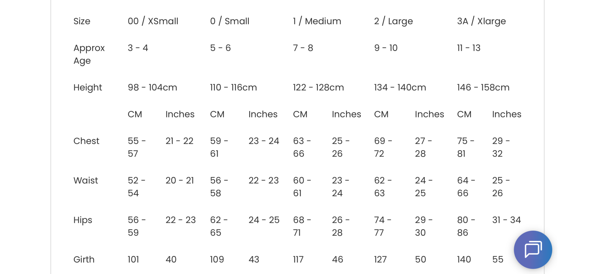 Sizing chart on photo slide